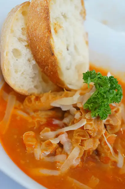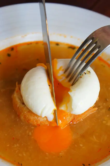 劃破水波蛋,讓香濃蛋液浸滿麵包混和著充滿匈牙利辣粉味的清湯享用