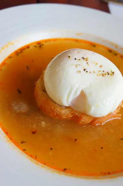 接下來的三道湯品也是道道好喝,首先是蒜味西班牙辣腸湯,水波蛋、西班牙臘腸與麵包的組合