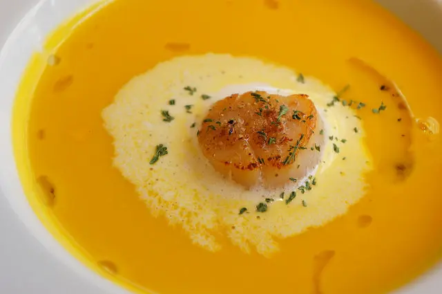 我則最愛這道帆立貝南瓜湯,如奶油般細滑口感的南瓜湯香濃甜美,北海道生食等級的干貝烤的恰到好處,粉嫩鮮甜,再點綴一點法國黑松露油來提味,好喝的想讓人再來一碗