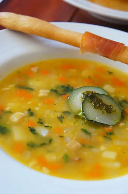 當季蔬菜燉湯,數種蔬菜長時間燉煮出來的美妙滋味,不用多說,肯定好喝的,一旁搭配的是生火腿捲著麵包棒,可以沾著湯品喝