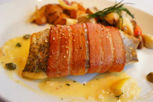 香料碳烤海鱸魚裹鄉村培根,培根煎焦香,鱸魚也烤的赤赤赤,都是我愛的口感,深海鱸魚肉質緊緻,在火山岩上高溫爐烤,培根的肉汁肥水不落外人田的通通滲入魚肉之中,可想而知魚中有培根,培根中有魚的地中海風味