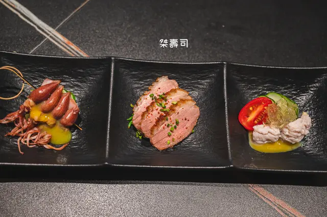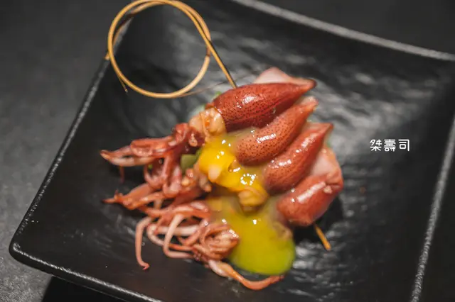 1680套餐/前菜,有海鰻魚、鴨胸、螢烏賊,季節限定的螢烏賊,搭配主廚用蛋黃、醋和高湯做成的特調醬,真的豪好吃~-而且真的是充滿新鮮的海味,第一次吃,整個就愛上了!