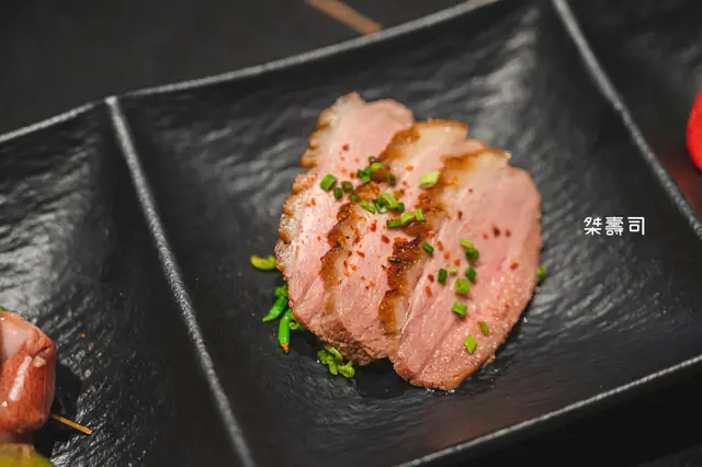 再來就是烤的剛剛好的鴨胸,肉質吃起來很嫩又多汁,還有這道海鰻魚,上面放了梅酒晶凍,底下是玉子味噌醋,旁邊還有小番茄跟小黃瓜,口感吃起來很層次又清爽!