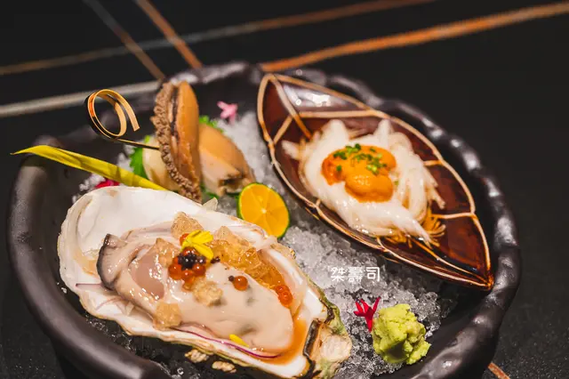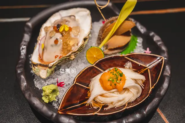 2980套餐/前菜,這道前菜一端上來,我老公整個眼睛發亮,都是他的最愛啊!!有南非鮑魚、熊本生蠔和馬糞海膽山藥細麵,熊本生蠔大概有一個巴掌大,真的很巨!上面還有水果醋做的果凍和魚卵,這口感吃起來很可以!