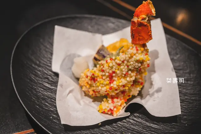 2980套餐/炸物,五色米果炸松葉蟹鉗,光是看到外表就覺得色彩鮮豔繽紛,讓人食指大動耶!旁邊還有一些蔬菜炸物天婦羅,那個松葉蟹鉗真的很大,肉質也很嫩,外面包裹著五色米果去炸,為蟹肉增加了酥脆的口感,大愛~