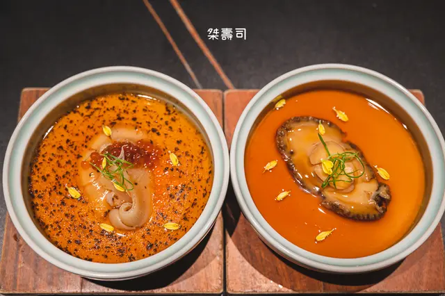 1680、2980套餐/蒸物,分別是松露魚翅蒸蛋和鮑魚蒸蛋,這兩道蒸蛋一上桌,真的驚呆!也太豪華了吧XD用料完全沒有再跟你客氣的,上面那個松露滿滿的,中間還有一大塊魚翅,旁邊還有加入一些鮭魚卵,顛覆蒸蛋的想像!再來就是這個鮑魚蒸蛋,使用的是九孔鮑魚,直接整顆呈現,老闆就是這麼霸氣啦!