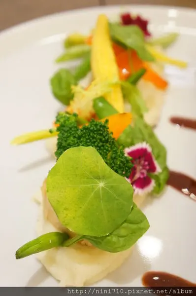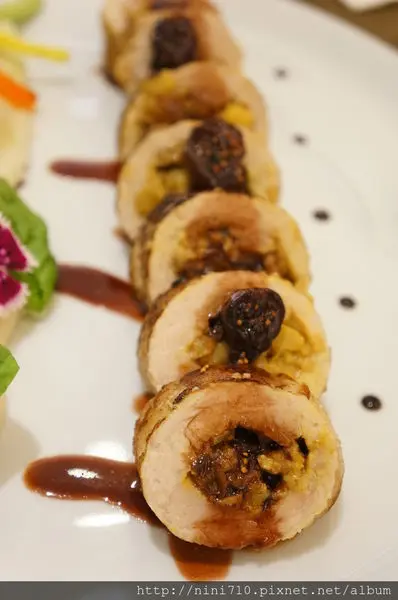 蘋果核桃豬肉捲佐無花果波特酒醬汁,這道菜色我個人超喜歡的,推薦一定要來試試看這道豬肉捲,旁邊搭配各式蔬菜及又細又綿的馬鈴薯泥,采采的蔬菜也大多來自於埔里的晏廷歐亞農場的頂級生菜,很多國外才有的蔬菜現在我們埔里也都種的出來囉!
