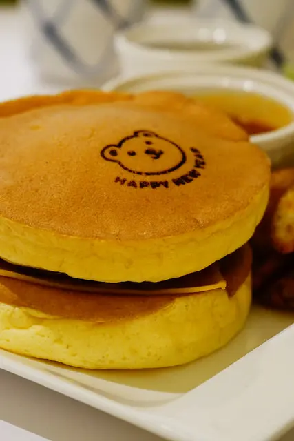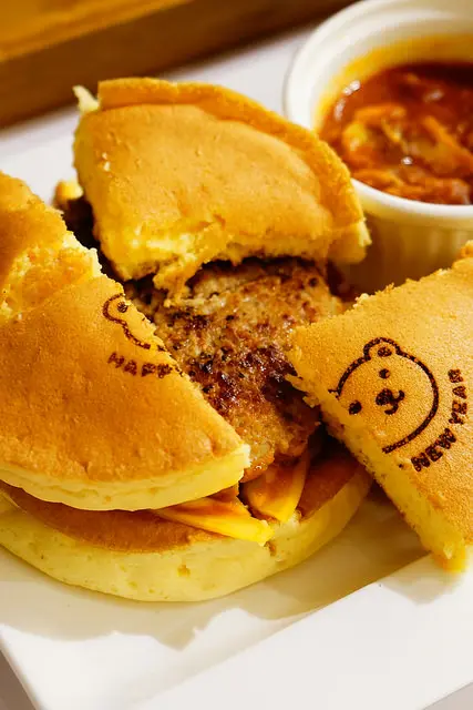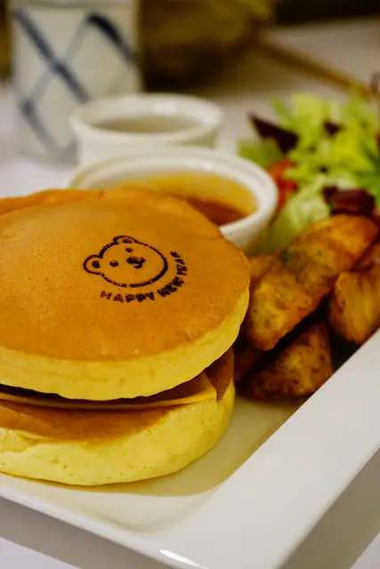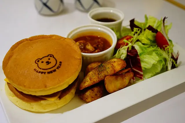 烙印著小熊的厚鬆餅下是豆腐做成的漢堡排與起司,多汁可口,建議兩片鬆餅包著漢堡排吃最鬆軟有層次,不需要沾一旁的肉醬就很有味道了,沾了肉醬就多了一股蕃茄風味,兩種味道都好吃