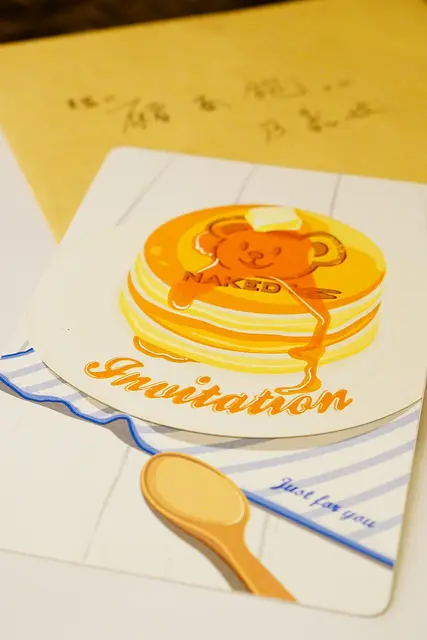 那天收到朵朵可愛的邀請函,看著圖片我就彷彿聞到鬆餅的奶香,幻想著奶油在熱熱的鬆餅上半融化的感覺,口水忍不住的滴在邀請函上,這個鬆餅熊圖案太有震撼力了