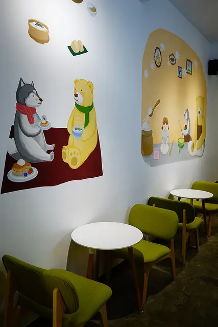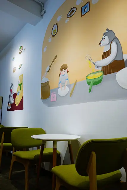 牆上的插畫是插畫家"禮拜三"的作品,這次的主題是黑妹(朵朵養的狗)和尼克熊一起玩樂煮飯的一天,朵朵一向是一個喜歡提攜新人的好老闆,很肯給新人機會,我超級欣賞他這一點的,他是一個充滿感恩又善良的人