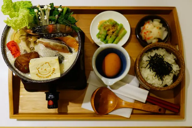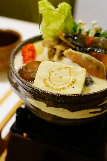 豆漿和牛奶調和而成的石狩鍋口感溫潤滑順,裏頭有大塊鮭魚和蝦子,還有各式各樣的蔬菜與火鍋料,裏頭有一款包起士的丸子好好吃唷!這幾天又要變冷,來嚐嚐不一樣的日式小火鍋也挺不錯的