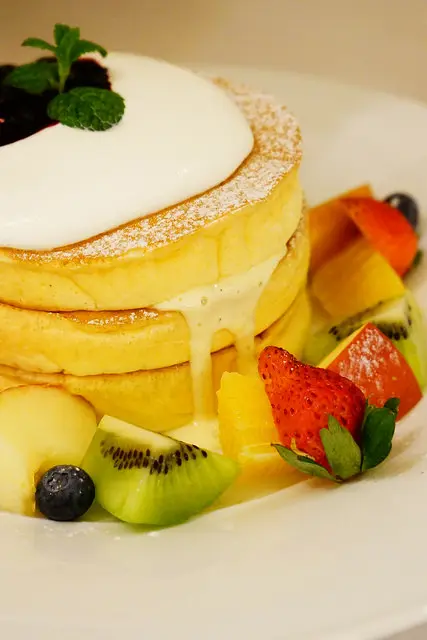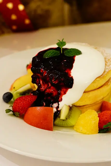 綜合水果鬆餅,自家製的卡士達奶醬搭上白泡泡幼咪咪的厚鬆餅三大塊,還有多種當令水果,怎麼能不被誘惑