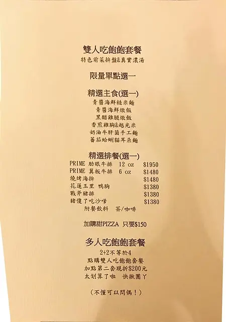 我們今天點了三套的雙人吃飽飽套餐,這樣點起來感覺可以吃的又飽又划算,而且加購甜披薩只要150元,原本我們有點的,但後來主廚忘了做,最後我們竟然也飽到吃不下,剛好順勢取消了,不過聽說某團長沒吃飽,後來又跑去吃永和豆漿,果然男生的食量跟我們就是不同,你早說嘛!!我們就不會把披薩給退掉了啊XDD