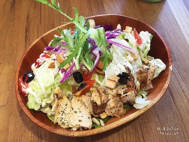 沙拉上還有番茄和黑橄欖點綴,淋上凱薩醬十分清爽
