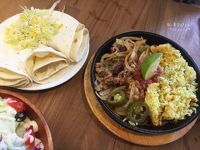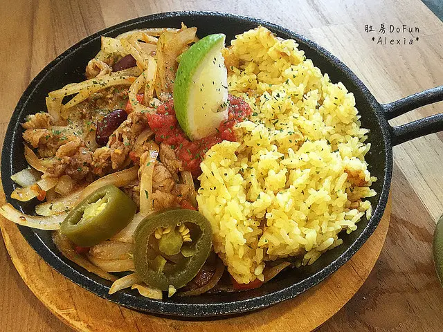 ▲鐵盤上裝上風味飯、牛肉洋蔥、莎莎醬