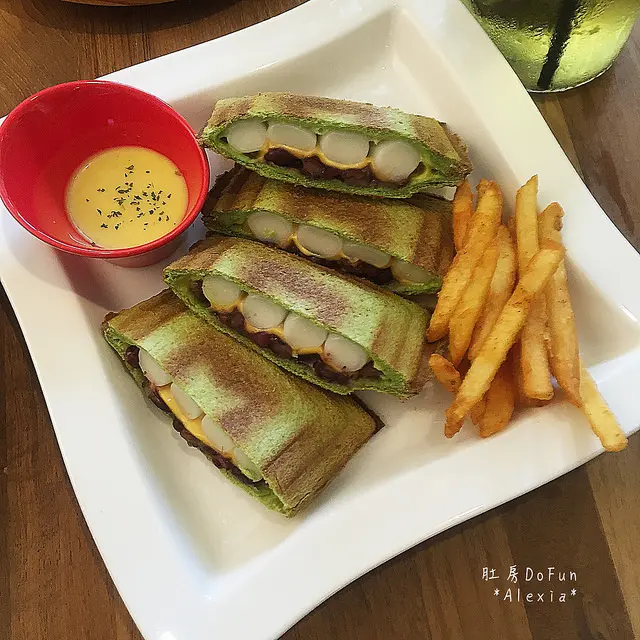 幾乎桌桌必點的抹茶紅豆年糕三明治,一旁還有薯條陪襯