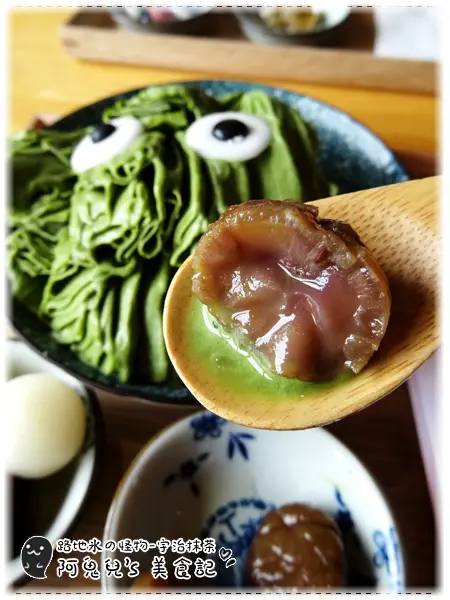蜜汁栗子真的很好吃耶~甜而不膩的滋味與抹茶雪花冰搭配,甜中又帶著抹茶香