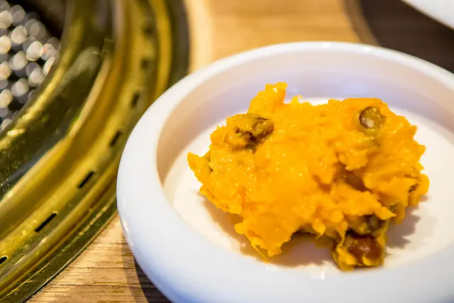 黃澄澄的綿密南瓜泥帶有自然的甜味,裡面加入松子、果乾增添口感,以小菜來講也有不錯的水準