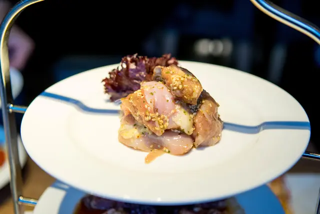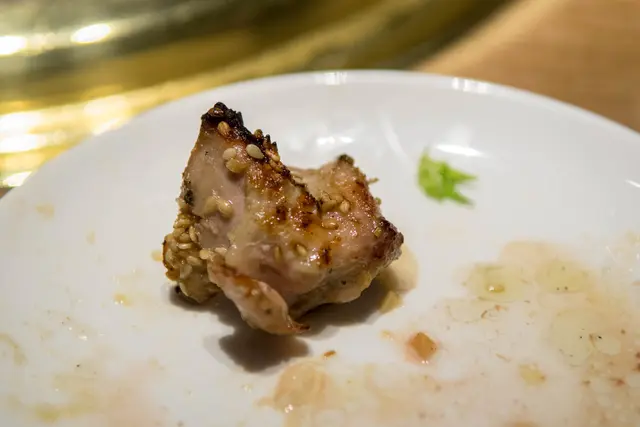 雞肉有先醃過,所以可以直接吃吃看原味,或是沾燒肉醬都好吃。雞肉肉質很棒,不柴且Q彈,雞皮如果烤得好會帶有很棒的香氣和酥脆的口感。
