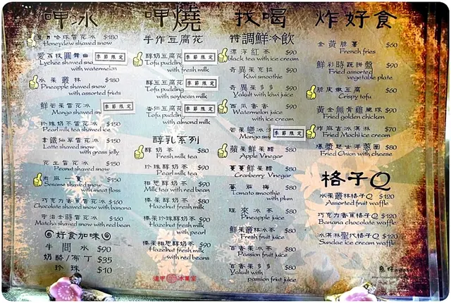 逢甲冰菓室有禁帶外食、每人低消80元、尖峰時段用餐45分鐘的規定喔!!鮮彩時蔬拼盤