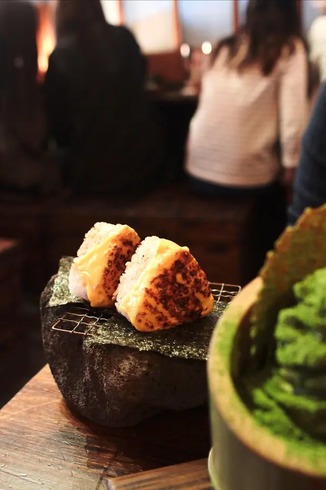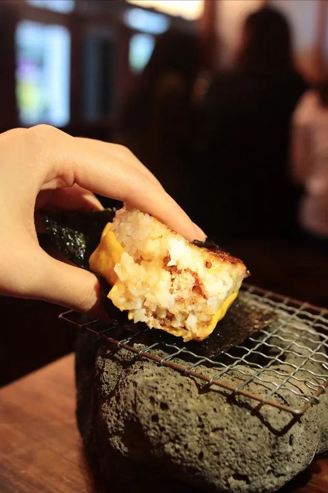 炙燒起士明太子烤糰子奉桌時是在 甫著鐵網的石頭上奉桌的,賣相顯心思。