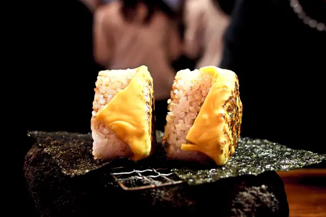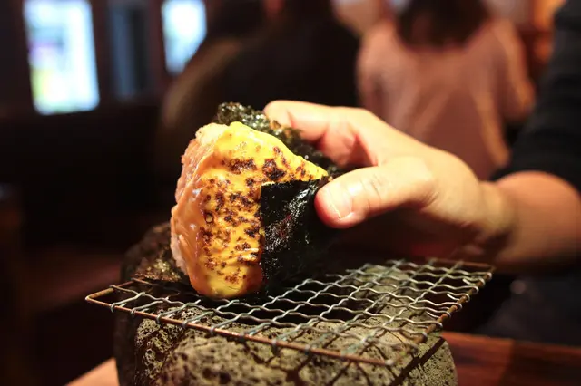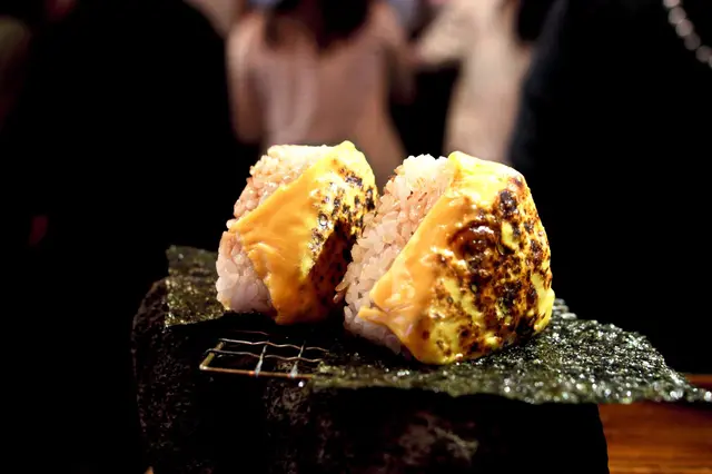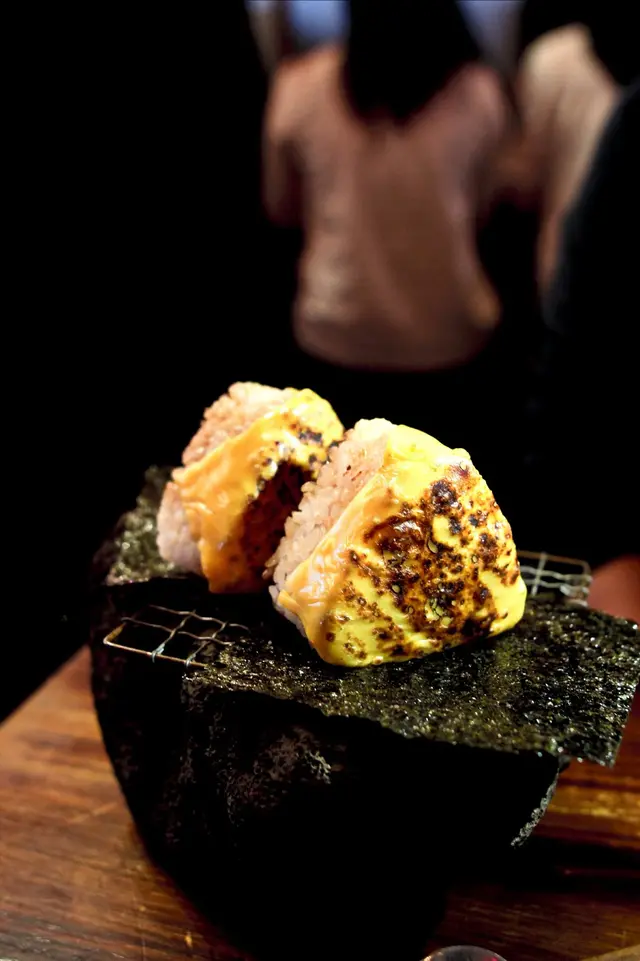 烤糰子香氣迫人! 飯糰面頭甫著芝士,再用火搶炙燒至焦色,紫菜放在飯糰下,等客人吃時才包起飯糰,避免水氣令紫菜變淋。