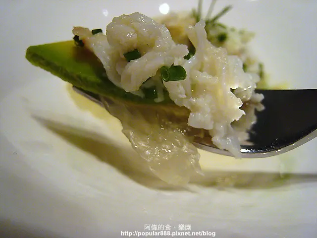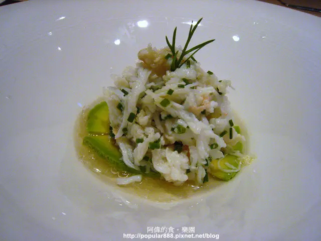 將帝王蟹肉切絲,下層墊著酪梨、柚子肉,