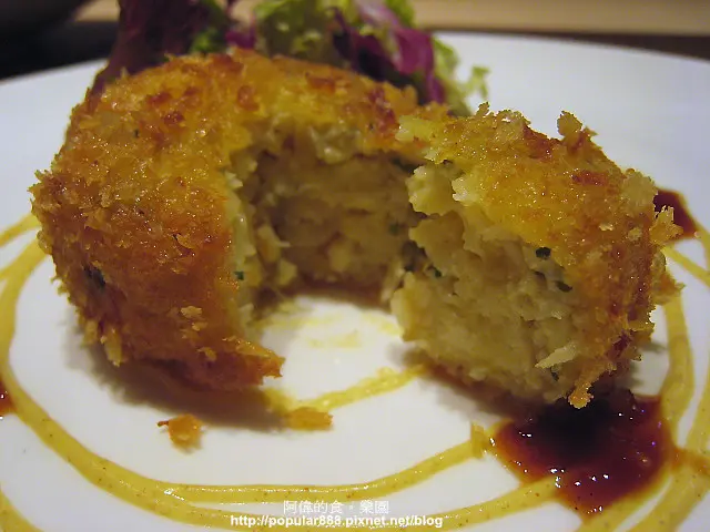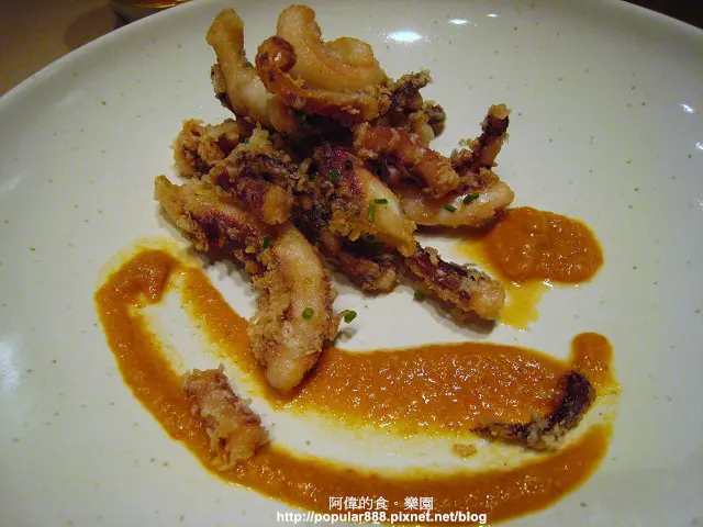 花枝裹粉炸得酥而不燥,盤上類似沙沙醬的作法