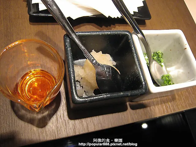 沾醬:(右)柴魚醬、(左)胡麻醬