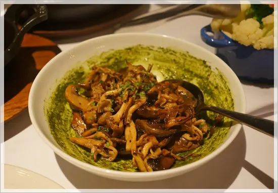 以青醬搭配多種菇類的蘿勒炒蘑菇,軟嫩的菇菇無論是單吃還是配著牛排吃都美味