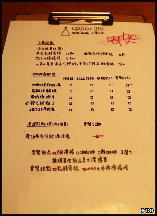 沒錯!!這兩張用手寫板夾的就是『Upper Life菜單,除了咖哩煮咖啡系列與每日限量的洋男料理外,其它都是飲料及甜點的選項(套餐含飲料和乳酪蛋糕)