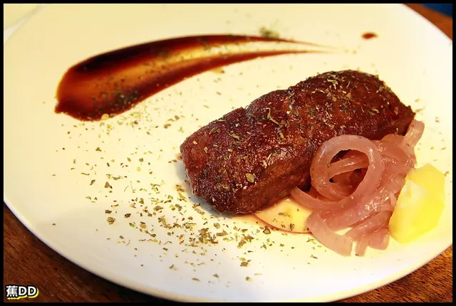 餐點來了,第一道洋男的每日限量料理『厚切牛肉佐紅酒洋蔥』(套餐280),雖然份量略少,切開後感覺為五分熟的熟度(點餐時不會問熟度~),不過連噗媽比較怕肉太生的人,完全可以接受,且牛肉肉質軟嫩鮮甜很好吃~