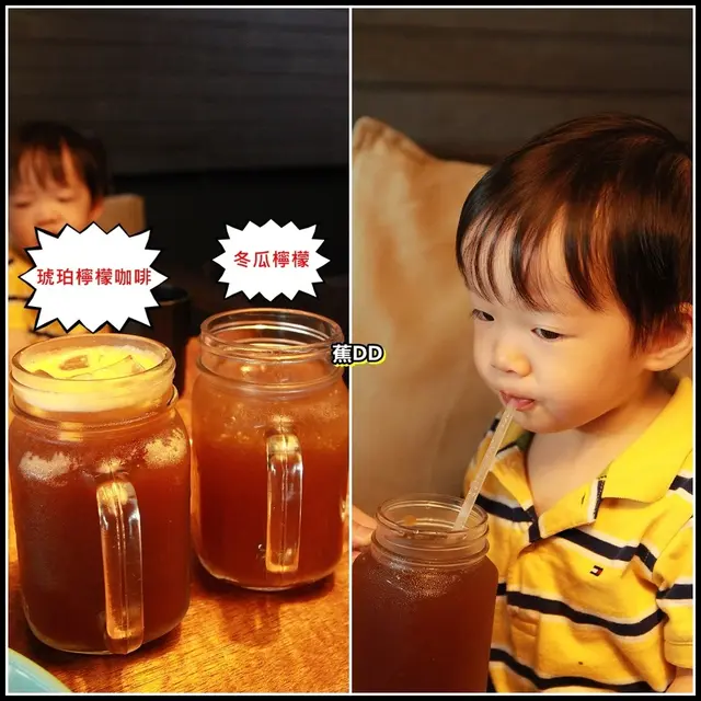 餐點飲料上桌囉,套餐附上『冬瓜檸檬』,另外一杯則是加價點了店家推薦的『琥珀檸檬咖啡』,『琥珀檸檬咖啡』是冰咖啡與檸檬的結合~非常特別,不過略帶點苦味對來飲料不拒的阿噗,也識相的選擇『冬瓜檸檬』來喝