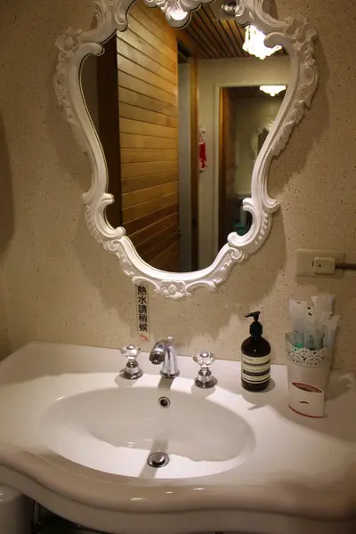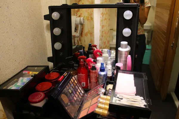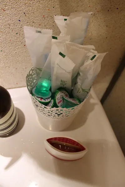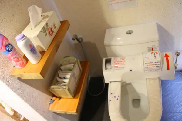 沒錯!!如圖所見!!!是整個化妝台 妝髮 化妝用品 香水 應有盡有 廁所也是那種可以換馬桶塑膠套的那種 厲害的是 他們旁邊連小北比的尿片跟痱子粉都有 超 級 貼 心 的