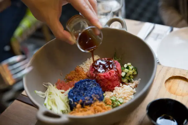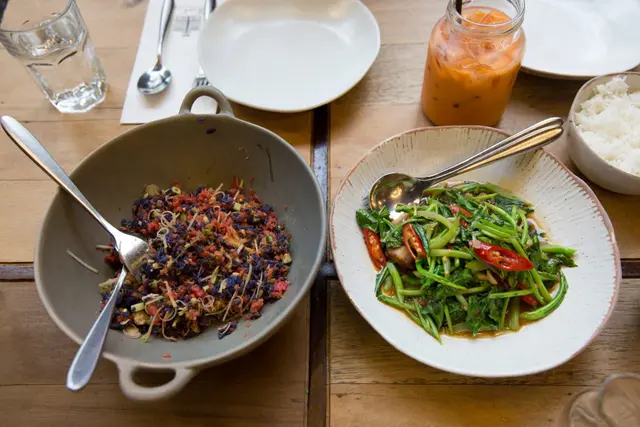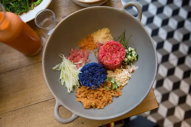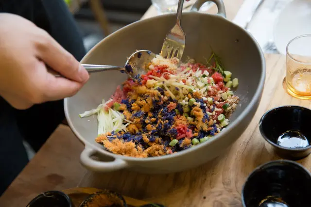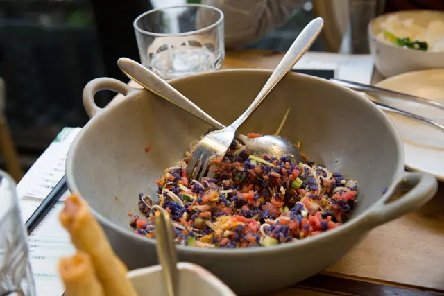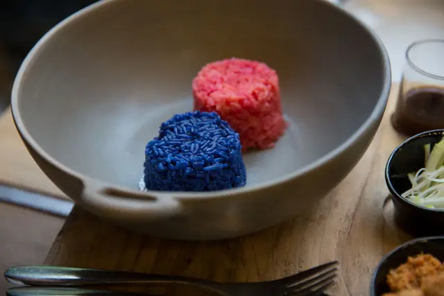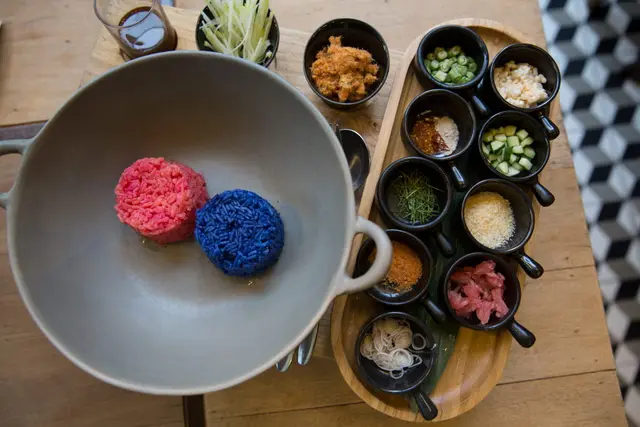 用藍色蝶豆花及紅色火龍果染色的米飯,配上香料及特製醬汁均勻攪拌,分別為:香茅、葡萄柚、蝦粉、椰子粉、檸檬絲、小黃瓜、辛香料、米果、長豆、肉鬆、青蘋果絲和特製醬汁