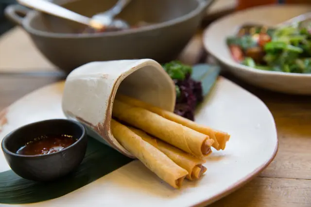 這道的春捲擺法深得我心,春捲細長如蛋捲形狀,金黃炸衣酥脆,包裹肉汁濃郁