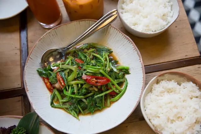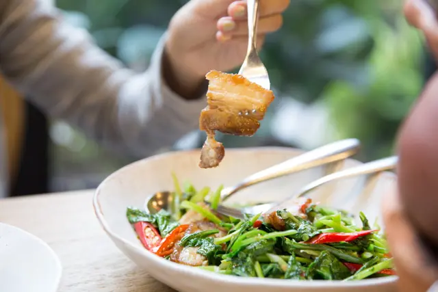 這是菜單裡價格最高的泰國蔬菜,好一段時間沒吃芥蘭是我選它的主因,以熱鍋煸出多餘油脂,帶皮的豬肉脆口清爽