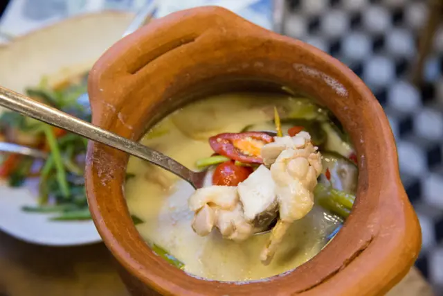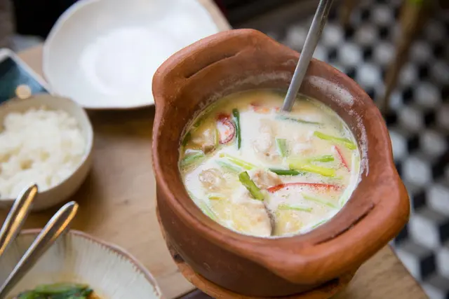 雞肉燉煮的軟嫩,也吸附飽滿的酸辣湯汁,倘若是四人以上的聚餐,非常推薦點這道湯,是以陶鍋承裝,而且上桌後還有小小爐火保溫
