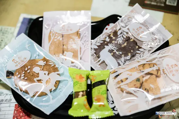 分別是核桃酥、巧克力花生曲奇、椰香水果餅乾與葡萄酥