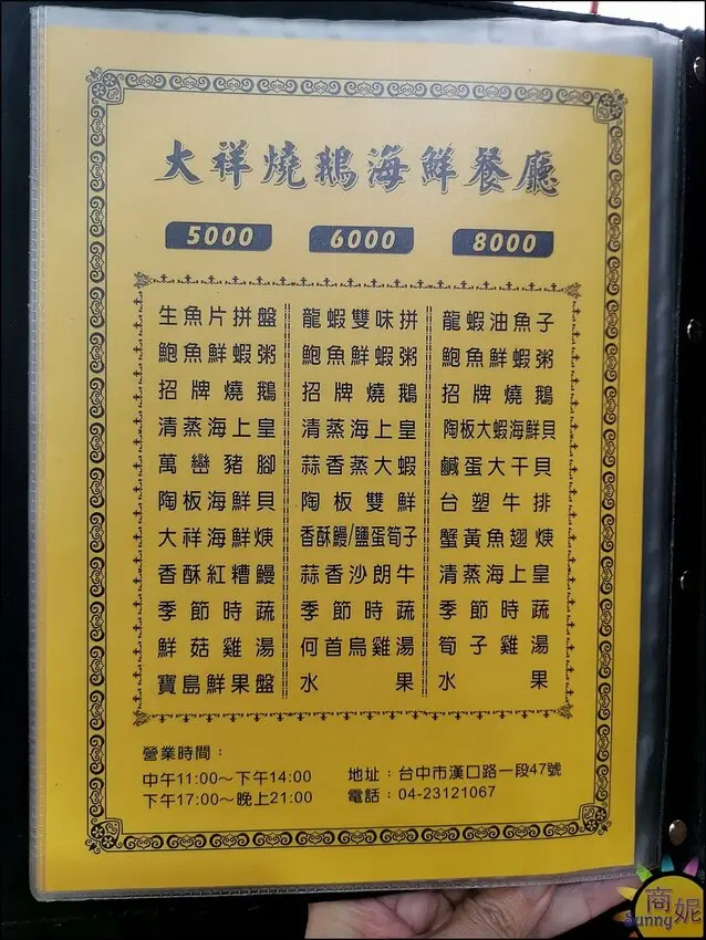 大祥餐廳菜單 一整本菜單菜色非常多,有單點也有合菜,單點價位大約200元上下相當平價。人數多的話推薦點合菜更超值,免服務費、包廂不加價,小家庭或者公司團體聚餐都很適合。我有拍下一整本菜單,請詳::< 大祥燒鵝海鮮餐廳菜單>