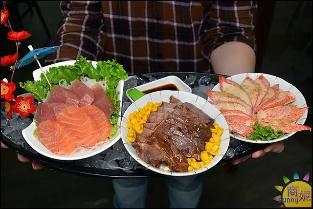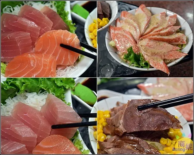 鮭魚跟旗魚生魚片都是厚切,口感Q彈味道鮮甜好吃。滷豬腱肉滷得很入味,QQ的口感越咬越甜。蟹腿棒淋上胡麻醬滋味也很不錯。