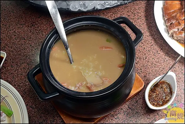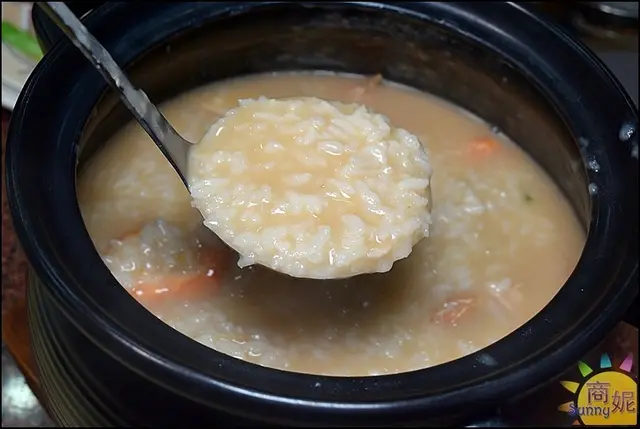 海鮮粥湯底有加上烤過後打碎的堅果,再加入雞骨豬大骨湯慢慢熬煮生米成粥,湯汁濃稠整鍋都是精華。