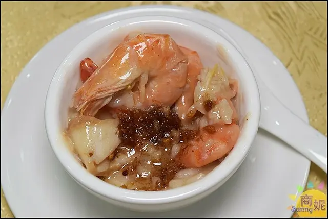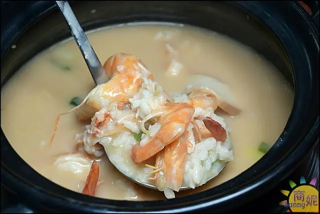 白蝦對切讓蝦膏融入海鮮粥當中,還有切片鮑魚加持,這鍋海鮮粥味道非常鮮甜好吃。