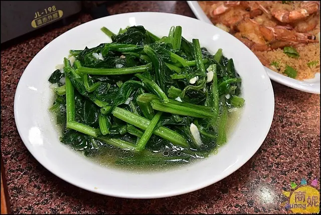 一整桌山珍海味,搭配一盤炒鮮蔬,清清爽爽的美味,很加分。
