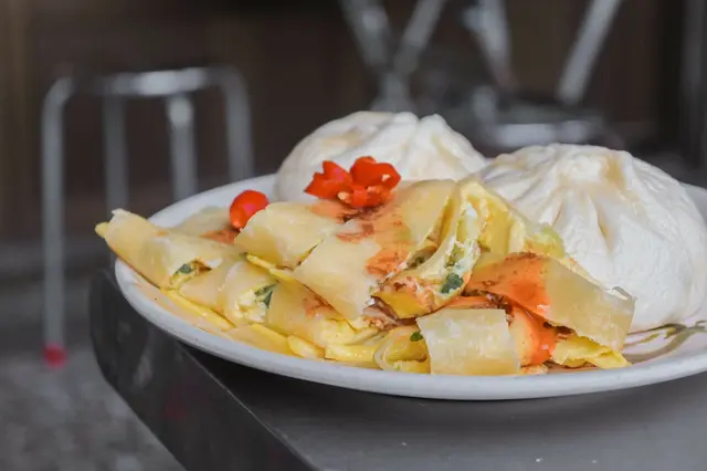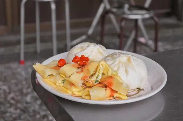 蛋餅皮偏軟,屬於古早滋味,淋上辣椒醬汁就是最配蛋餅的完美吃法,雖然很純粹由蔥、蛋、餅組成,滋味是可以想像的,但我卻還挺喜歡那越嚼越香的古早香氣。