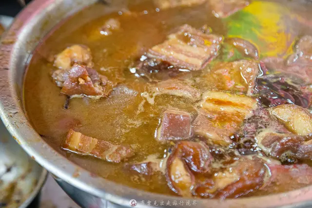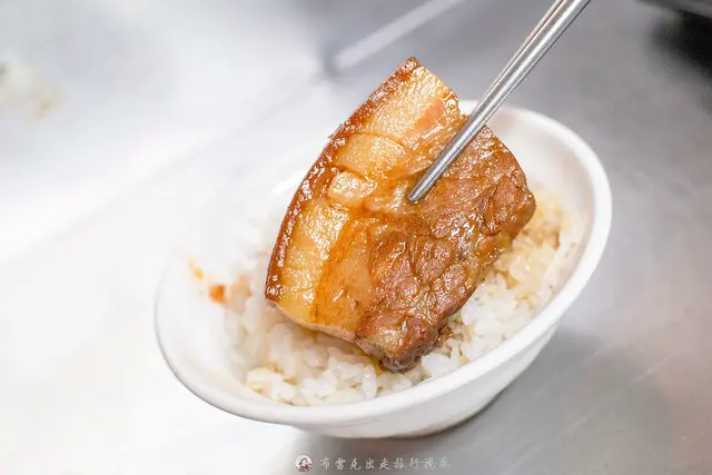 在次強掉一下,到了台中,台中魯肉飯認知可能跟台北不太一樣,台北魯肉飯指的是切丁、切條或絞肉滷上肉汁淋在白米飯上,但到了台中是肉燥飯,台中魯肉飯指的是蹄䠙腿庫或三層肉所組成的爌肉飯,現在《山河魯肉飯》魯肉飯大多就讓你選三層的爌肉,要肥一點的還是要瘦一點的,肥的就像是帶皮腿庫一樣,建議點適中就好。