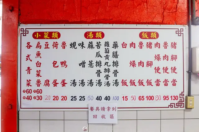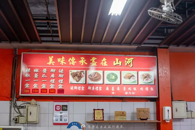 山河魯肉飯菜單上有分便當跟一般的飯類,便當的話則是有些便菜,從80元的肉燥飯便當到130元豬腳便當,沒含便菜的有65元的魯肉飯與100元豬腳飯,湯品價格都還蠻便宜一碗也才25元,限定版的蔴薏湯也才50元,算是台中特色,小菜有分大中小份量從20元到60元,也有豬腳跟腿庫禮盒,現在都會用圖片來跟消費者告知怎麼點。