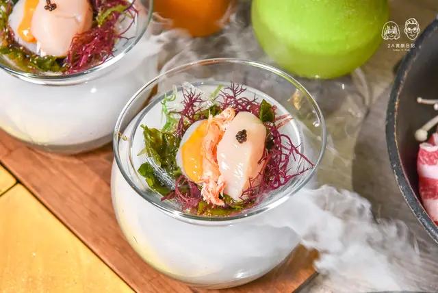 日本料理店才看得到的餐點,在這也可以吃到!海膽干貝一口杯使用日本生食級干貝來製作,上頭加上魚子醬點綴,裡頭則是奢侈的包入松葉蟹肉與海膽吃起來的口感軟嫩之外還特別的鮮美,讓不敢吃生食的我也覺得超級鮮!底層搭配淋上芥末油醋醬的日本海藻,酸酸甜甜的很清爽。