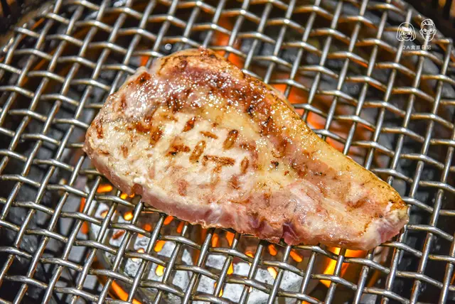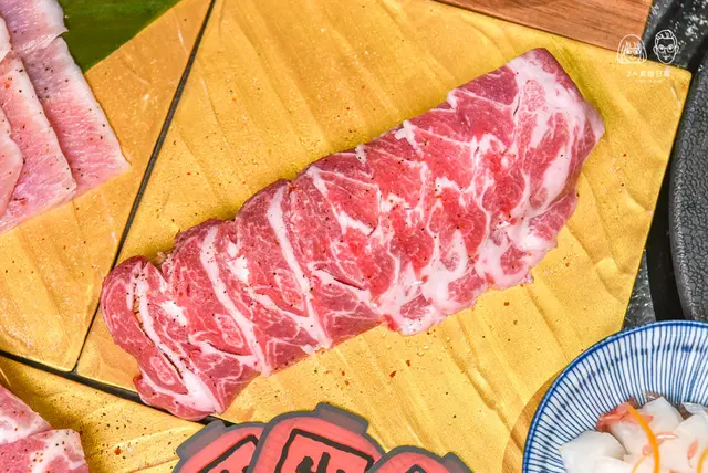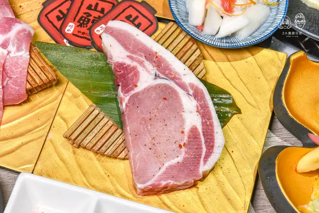 一整片的里肌肉選用英國盤克夏豬,厚度十足頗有份量,這道可以請店家幫忙代烤,英國盤克夏豬烤到表面金黃色,裡頭則是還保有粉嫩的色澤狀態,一剪開即能感受到豐沛的肉汁。
