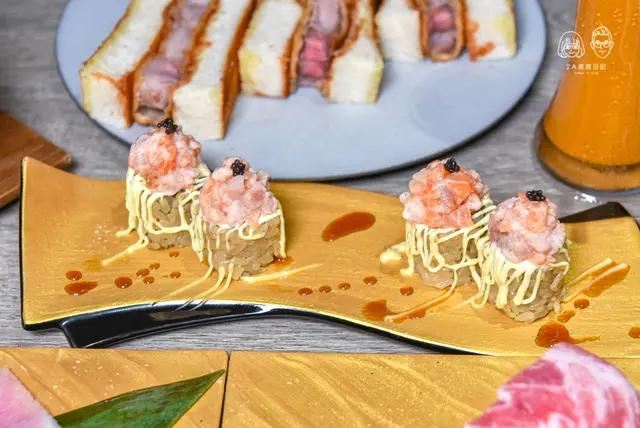 使用赤醋做的壽司飯口感彈牙不軟爛,並有著淡淡的赤醋香氣,跟過往的壽司香氣不太一樣,裡頭並包有鱈場蟹與小黃瓜,再搭配上頭的鮪魚及鮭魚生魚肉,口感層次鮮明且爽口。